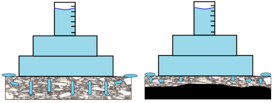 Diagram of the flow of water from a field falling head permeameter. On the left, water flows through the interconnected air void on an untreated mix. On the right, water cannot pass the VRAM barrier but still flows laterally.