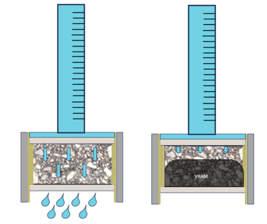 Diagram shows a lab falling head permeameter where lateral (horizontal) water flow is prohibited by the testing device. On the left, water flows through interconnected voids of an untreated mix. On the right, VRAM creates an impermeable barrier.