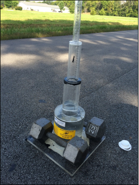 In the field, the base of the permeameter is sealed to the pavement using putty, and the apparatus is held down with weights. Water is then poured into the top of the tube until it is filled. The tube has markings to measure the rate of water flow. The faster the water flows through the pavement, the higher the permeability.